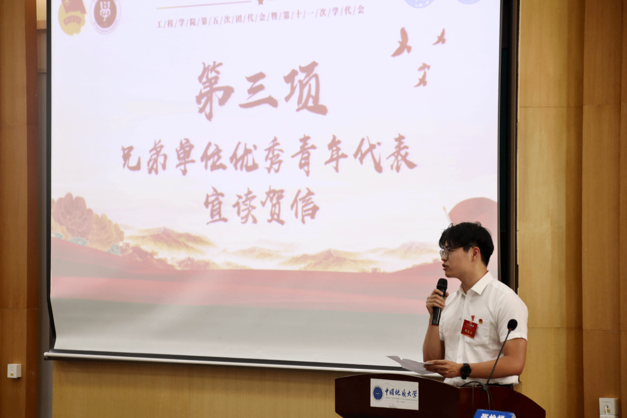 兄弟单位优秀青年代表华中农业大学工学院专职团干贾彦平和2024年全国“青马工程”班委、华中科技大学马克思主义学院硕士研究生张扬分别宣读贺信,贺信中饱含着兄弟院校对十大买球官方网站的美好祝愿与深厚情谊,彰显了青年一代团结奋进、携手共进的精神风貌。本次大会还收到了华中科技大学土木与水利十大买球官方网站、武汉理工大学土木工程与建筑学院等兄弟高校团委,以及中建三局基建投、武汉地铁集团和中交四航院研究院等企业团组织的贺信。