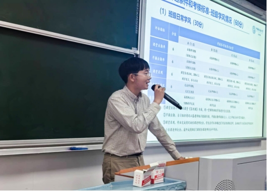 2024级辅导员彭友元介绍《买球赛十大平台(武汉)十大买球官方网站“优良学风示范班”创建评选办法》。他从“优良学风示范班”总体要求、创建流程、考核指标、奖惩办法等四个方面进行介绍,重点解读了班级政治理论学习、遵纪守法与文明修养、集体观念、班级制度建设、班级干部表现等5项班级综合表现指标,课堂出勤、早操出勤、课堂表现、作业完成情况、自习组织情况等5项班级日常学风指标,平均学分绩点、优秀率、及格率和英语四级通过率等4项班级课程成绩指标,以及学生参加科技创新活动等附加分项目指标。他要求同学们仔细阅读创建办法文件,对照量化评估考核指标,积极开展富有班级特色的学风建设活动。