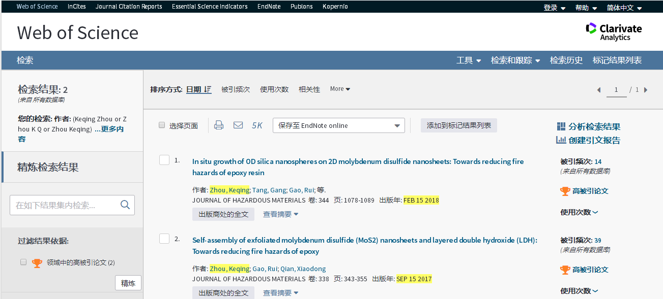 基本科学指标数据库(Essential Science Indicators,简称ESI)最新数据显示,安全工程系周克清老师发表的论文“In situ growth of 0D silica nanospheres on 2D molybdenum disulfide nanosheets: Towards reducing fire hazards of epoxy resin”入选高被引论文。该论文是周克清老师以买球赛十大平台(武汉)十大买球官方网站为第一单位、第一作者和通讯作者身份发表的第2篇ESI高被引论文。2018年7月周克清老师发表的论文“Self-assembly of exfoliated molybdenum disulfide (MoS2) nanosheets and layered double hydroxide (LDH): Towards reducing fire hazards of epoxy”曾同时入选ESI高被引论文和热点论文。