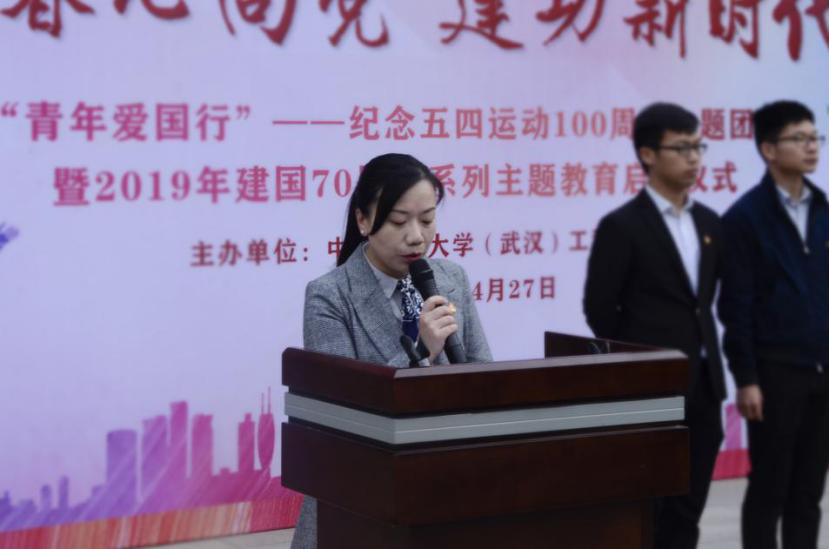 黄蕾向同学们讲授“纪念五四运动100周年”主题微团课。她讲到,同学们作为新时代的青年人,既是追梦人,也是圆梦人;既有际遇和机缘,也有矛盾和困惑;既生逢其时,也重任在肩。她希望同学们勇担时代重任,牢记总书记“八字真经”,做到爱国、励志、求真、力行,努力成为“品德高尚、基础厚实、专业精深、知行合一”的一流地大学子。