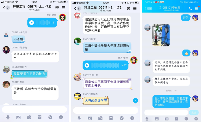 安全工程系教师采取课前预习、课中提问、课后作业多种方式,增强师生互动。杨丹老师在《环境工程》课程每节课之前都会上传学习资料、布置课程预习要求;桂蕾老师在《工程项目管理》和《地质灾害风险分析》课程中实时解答学生提问,并针对学生反馈及时调整课程进度;庞奇志老师在《安全管理学》课程采用视频授课方式,与学生积极互动,一对一解答学生疑问。