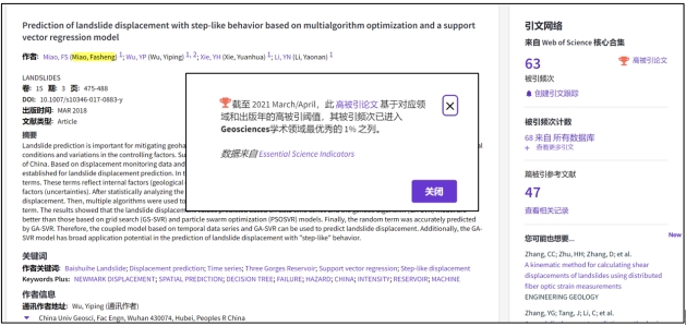 (通讯员:黄静)根据2021年7月基本科学指标数据库(Essential Science Indicators,简称ESI)最新数据显示,十大买球官网苗发盛副教授、吴益平教授团队于2018年在国际工程地质领域顶级期刊《Landslides》上发表的学术论文“Prediction of landslide displacement with step-like behavior based on multialgorithm optimization and a support vector regression model” 入选ESI高被引论文(Highly Cited Paper)。