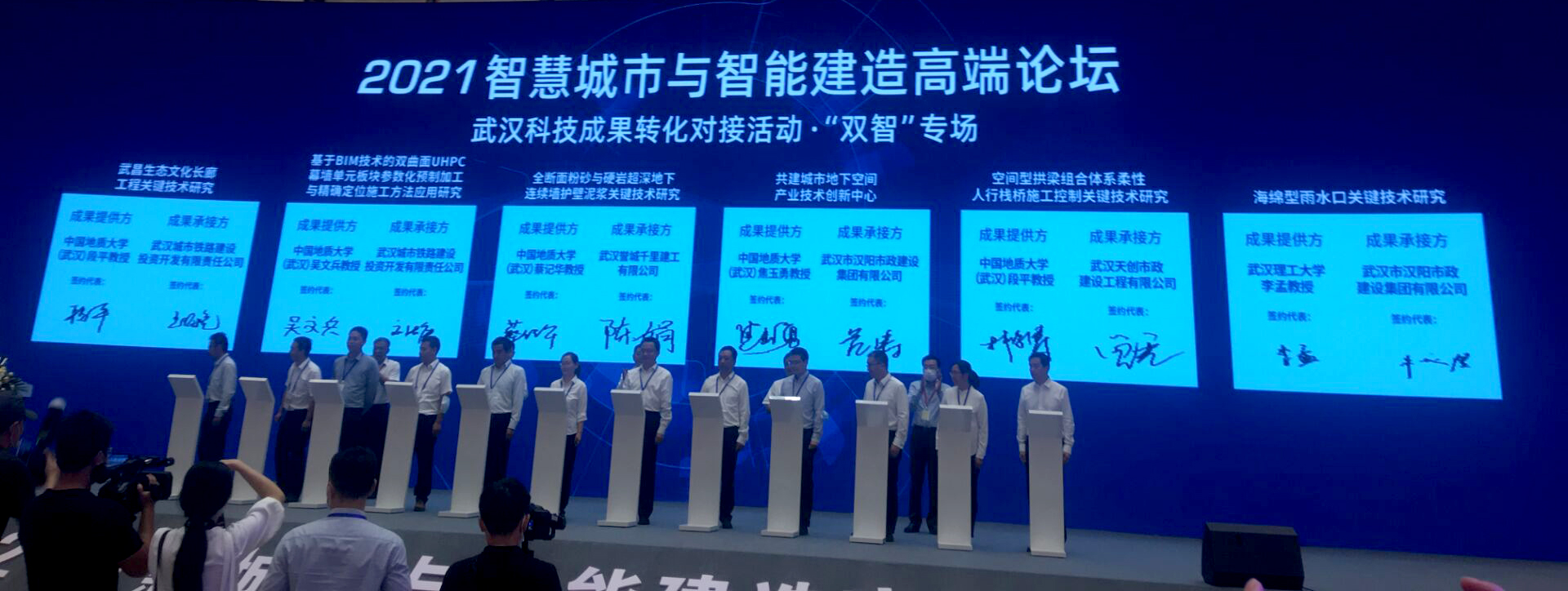 (通讯员:刘浩、张美霞)9月24日,十大买球官方网站院长焦玉勇教授应邀率队出席2021智慧城市与智能建造(“双智”)高端论坛。开幕式“武汉科技成果转化对接活动 双智专场”上,焦玉勇带领十大买球官网蔡记华、吴文兵、林俊涛、刘浩4位老师分别与武汉市汉阳市政建设集团有限公司、武汉市誉城千里有限公司、武汉市城市铁路建设投资开发有限公司签订了共建技术创新中心、人才培养与科技成果转化合作协议。十大买球官网与武汉市相关部门和企业开展深度合作,将为湖北省“一主引领、两翼驱动、全域协同”的区域发展布局,和武汉建设“宜居城市、韧性城市、智慧城市、绿色城市、人文城市”的重大需求提供技术和人才支持。