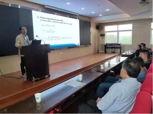 陆萌博士以“Transient CO₂Wellbore Flow”为题,介绍了 CO₂注入地层时的多物理场多相流动规律。陆博士首先介绍了 CO₂注入地层过程中的控制方程,包括考虑多相流的质量守恒方程、能量守恒方程以及动量守恒方程,然后介绍了实际进行数值计算时,采用经验方程与理论方程耦合计算遇到的数值发散问题。针对模拟中的相变问题,陆萌博士对比了不同的相变控制方程,针对如何处理不同情况下的相变给出独到的见解,介绍了相劈分行为、热动力闪蒸与相稳定性分析。陆博士介绍了多个实例分析,包括在二氧化碳封存项目中井筒注入冷 CO₂的计算分析、石油开发中超热水的注入、以及 CO₂相关的自然现象如冷泉喷发的模拟分析。根据他多年从事数值计算的工作经验,陆博士展示了程序计算结果、解析解和实测结果的对比,并分析了误差产生原因。陆萌博士还介绍了有限体积法、有限差分法和有限元法法等不同数值计算方法的特点,有限元法的局部守恒性问题以及有限体积法在局部守恒方面的优势。