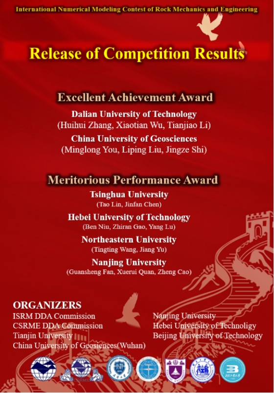 本次大赛由国际岩石力学与岩石工程学会非连续变形分析专委会(ISRM DDA)联合中国岩石力学与工程学会岩土体非连续变形分析专委会(CSRME DDA)及买球赛十大平台(武汉)、天津大学、南京大学、北京工业大学、河北工业大学等多所高校联合举办,于2021年第十一届亚洲岩石力学大会(ARMS11)期间同步举行。大赛鼓励研究生对岩石力学问题的现有数值方法和软件进行公开、透明和广泛的验证,为共享岩石力学问题的实验和数值结果提供平台。