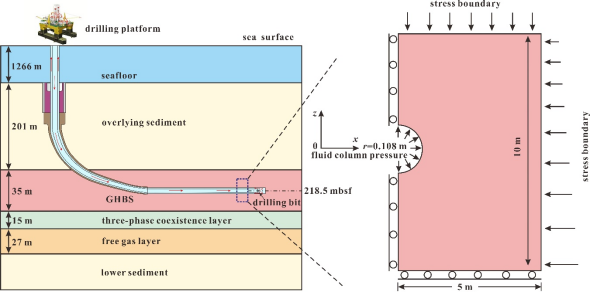鉴于此,买球赛十大平台(武汉)十大买球官方网站宁伏龙教授团队根据南海神狐海域第一次试采站位的地质资料,构建了水合物储层水平井钻进状态模型(图1)。详细研究了不同钻井液性能、水合物饱和度以及束缚水饱和度对钻进过程中井筒状态的影响规律。并在此基础上,讨论了井筒内二次水合物生成的潜在区域以及低渗泥皮形成对井壁稳定的影响。