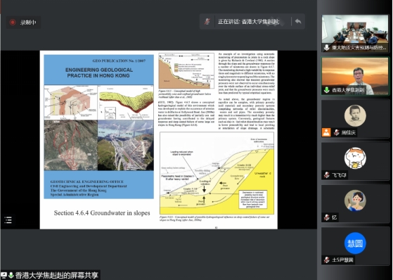焦赳赳教授讲座题目为“边坡地下水”,讲座首先从边坡区域地下水分布规律角度,阐述了边坡稳定性分析中,不能局限于边坡体本身,而应该考虑更大区域的水文地质边界;随后,焦教授通过简述地下水潜水与承压水的基础概念和理论,引出了承压水在边坡稳定性分析中的重要性,并证实了承压水在香港地区的普遍性;结合香港Pak Kong滑坡案例,指出了高密度城市群建设改变区域地下水排泄路径,是导致边坡失稳破坏的重要原因之一;最后,焦教授综合分析了香港Siu Sai Wan滑坡、Ching Cheung Road滑坡、Tin Wan Road滑坡、Lai Ping Road滑坡等数个滑坡案例,提出了香港地区典型的椅状滑坡模式,并分析了其失稳破坏机制。