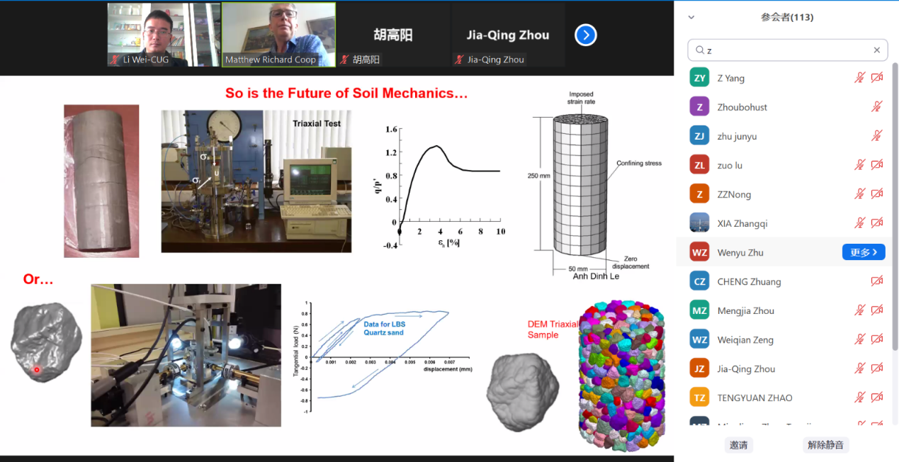 (通讯员 黎伟)2022年7月21日下午,应买球赛十大平台(武汉)唐辉明教授和黎伟副教授邀请,伦敦大学学院Matthew Coop教授应邀作客2022年第13期“重大地质灾害预测与防控学科”111创新引智基地系列学术讲座。讲座采用Zoom在线会议形式进行,由黎伟特任副教授主持,周佳庆特任教授、叶阳特任教授、张雅慧特任教授、付茹副教授等以及香港大学、香港城市大学、华中科技大学、浙江大学、中南大学、东南大学、合肥工业大学、西安交通大学、中国科学院武汉岩土力学研究所等多个单位120余名师生在线聆听了此次报告。