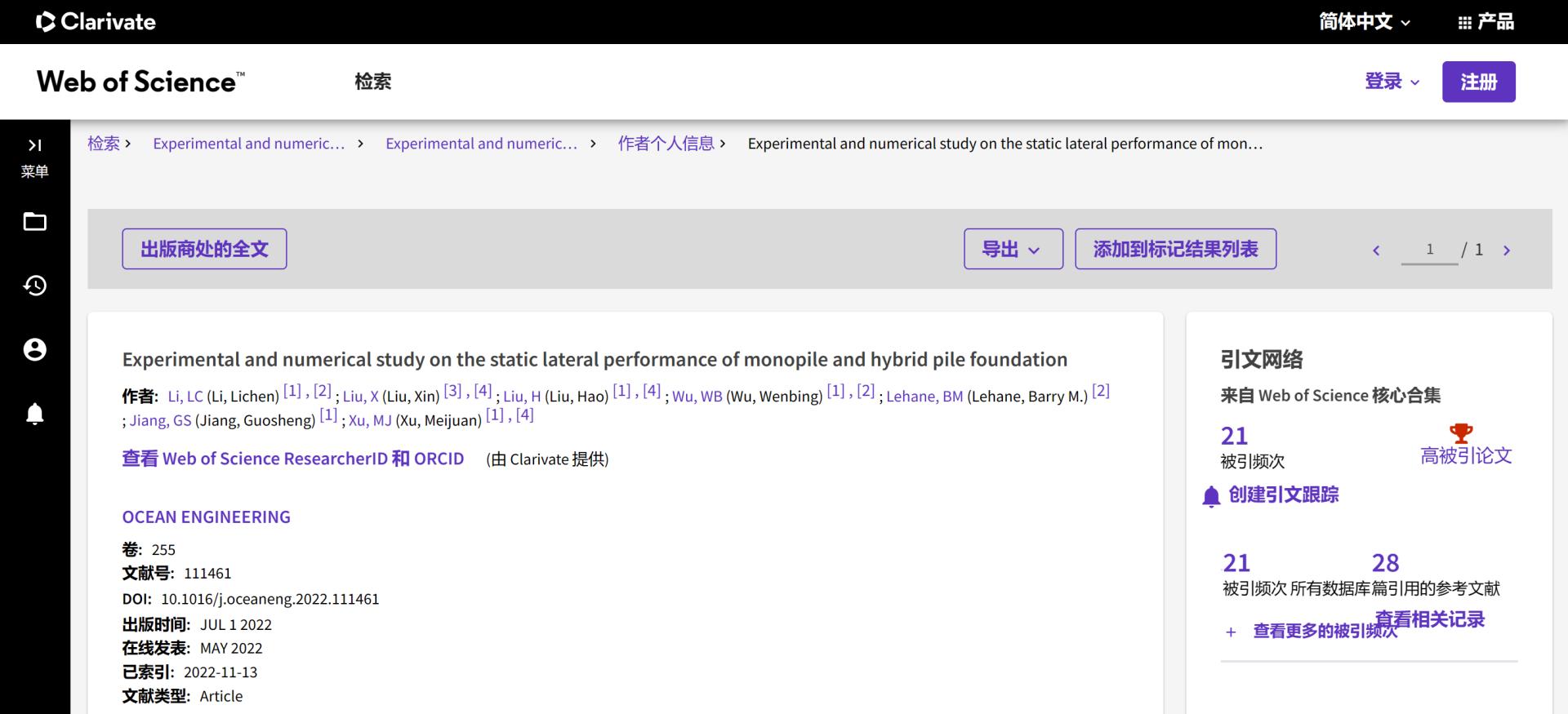 (通讯员 吴文兵)根据2023年6月基本科学指标数据库(Essential Science Indicators,简称ESI)最新数据显示,十大买球官方网站勘察与基础工程系蒋国盛教授团队于2022年在国际海洋岩土领域权威期刊Ocean Engineering上发表的学术论文“Experimental and numerical study on the static lateral performance of monopile and hybrid pile foundation”入选ESI高被引论文。该论文第一作者为勘察与基础工程系博士后李立辰,通讯作者为吴文兵教授,买球赛十大平台(武汉)十大买球官方网站为第一署名单位。