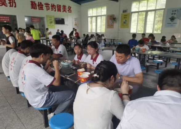 启动仪式结束后,在共青团武胜关镇委员会相关领导陪同下,高晓东一行赴广水市武胜关镇孝子店中心小学探望正在开展支教活动的明德风·爱心助学团成员。一行人走进教室,旁听了正在教授数学课的来自材化学院的李梓睿同学的课程,“小老师”整齐的板书、清晰的讲授,书写着支教团成员对这支教工作的热爱和对“祖国花朵”的细心呵护,为远在山区的孩子们送来了来自地大青年的倾情助力,引导他们全身心遨游在知识的海洋中。上午的课程结束后,一行人在学校食堂与助学团成员共进午餐,简单的饭菜,大家吃得津津有味,艰苦的环境,大家乐在其中,心怀着关爱下一代、服务社会的宏伟志向,再苦的日子也过得有滋有味。