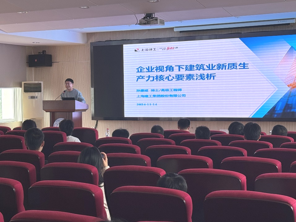 孙廉威院长以企业视角下建筑业新质生产力核心要素浅析为主题,首先通过行业实例说明了当前建筑行业和土木工程行业的发展现状,并且对企业发展的瓶颈进行了阐述。随后,从企业角度提出了发展新质生产力的思考,新质生产力是推动建筑业转型发展的内在需求,也是推动建筑业颠覆性变革的重要着力点。孙廉威院长结合他自身及团队在企业进行科技创新工作实例,分析提出了建筑业新质生产力的核心要素。最后,孙廉威院长向同学们分享了企业对复合型人才的迫切需求,并详细讲解了如何通过培养多领域技能和知识,将自己塑造成为企业急需的复合型人才,从而增强个人的职业竞争力。