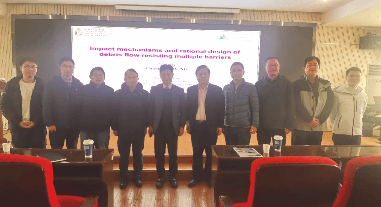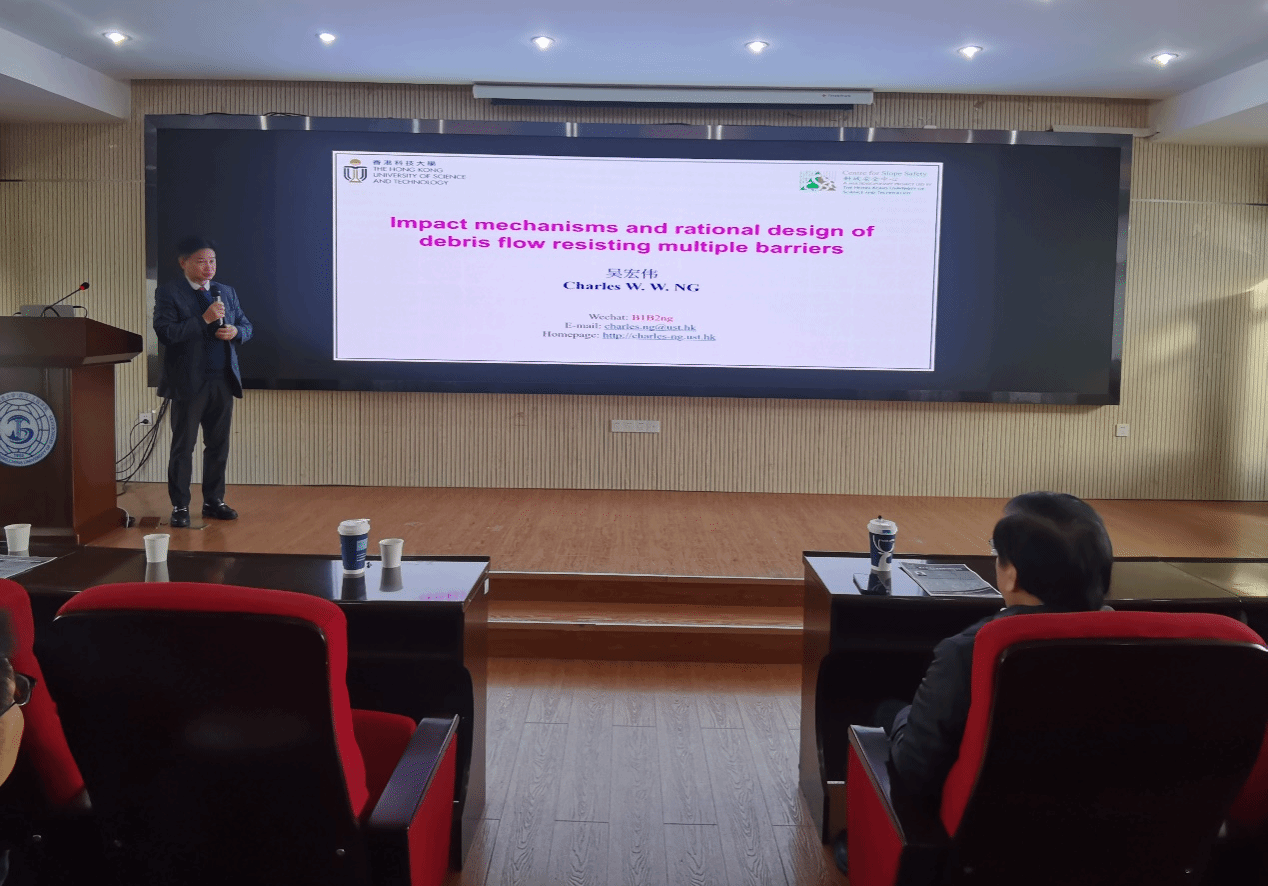 吴宏伟教授作了题为“Impact mechanisms and rational design of debris flow resisting mutltiple barriers”的学术讲座。吴宏伟教授首先介绍了香港科技大学的学科发展历史及国际排名等相关情况,欢迎十大买球官网同学前往香港科技大学进行联合培养,开展学术交流活动。随后,介绍其团队近年来在泥石流刚性和柔性屏障设计方面的水槽模型测试和数值模拟试验成果,揭示了典型泥石流对多重屏障的影响机制,为泥石流多重屏障设计提出合理建议。