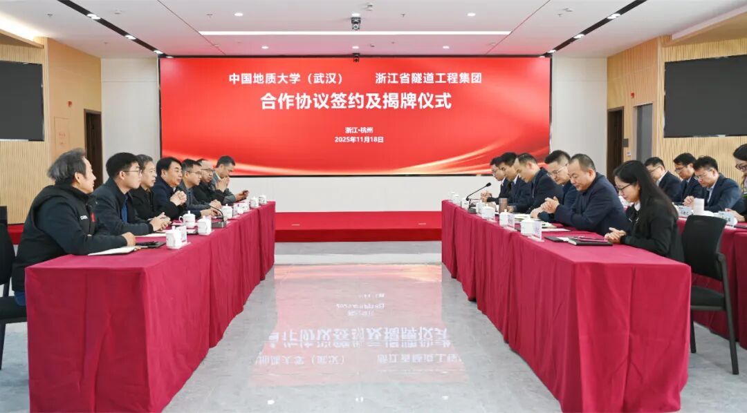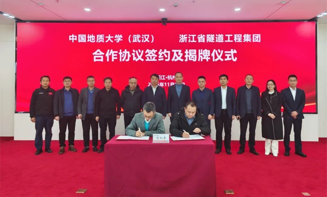 买球赛十大平台(武汉)与浙江省隧道工程集团有限公司正式签订《研究生联合培养基地合作协议》与《产学研合作协议》,举行了“研究生联合培养基地”和“地质e站”揭牌仪式,开启了校企合作新篇章。
