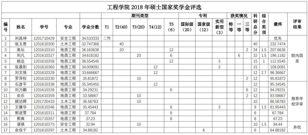 经个人申报,学院研究生国家奖学金评审委员会秘书处资格审查,学院研究生国家奖学金评审委员会于2018年9月29日下午组织通过资格审查的申报者(其中博士研究生14人,硕士研究生17人)进行答辩评审,学院研究生国家奖学金监审委员会全程监督。会议确定了刘昌坤等8名硕士研究生,刘浩等4名博士研究生为十大买球官方网站2018 年研究生国奖学金候选人。现将十大买球官方网站 2018 年国家奖学金候选人公示(见下表)。
