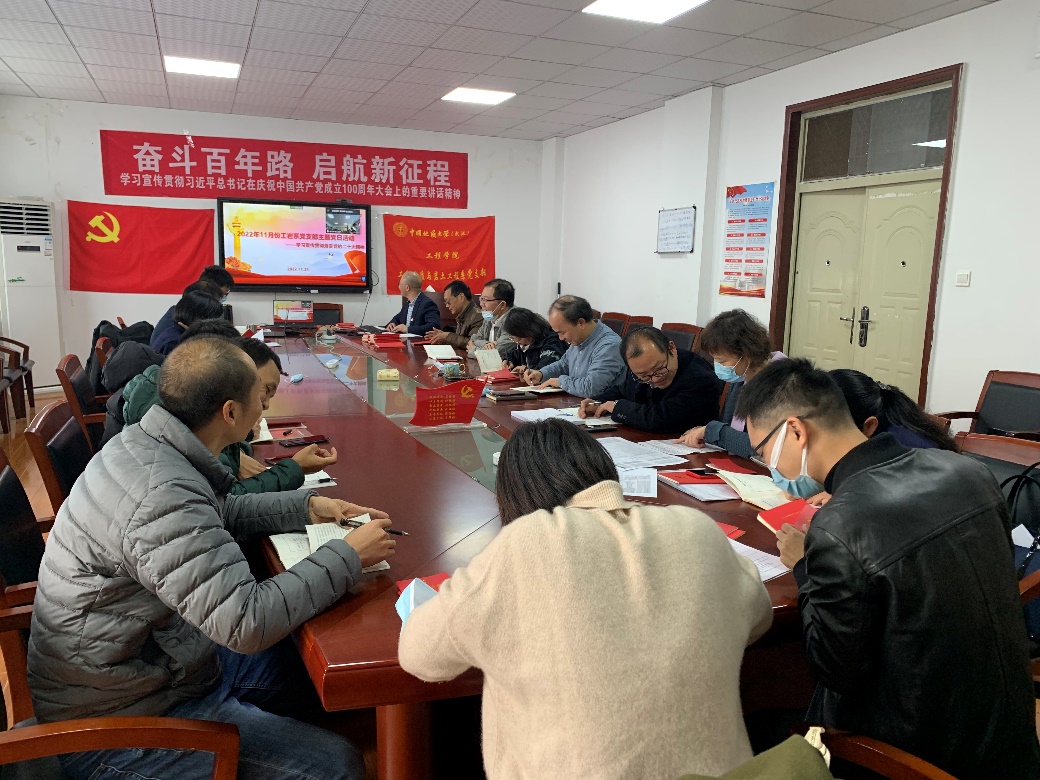 (通讯员 黎伟)2022年11月24日下午,工程地质与岩土工程系党支部在工程楼201开展了11月份主题党日活动。本次活动的主题是:学习宣传贯彻落实党的二十大精神。支部书记葛云峰同志主持了本次主题党日活动。因疫情原因,本次活动线上线下同步进行。